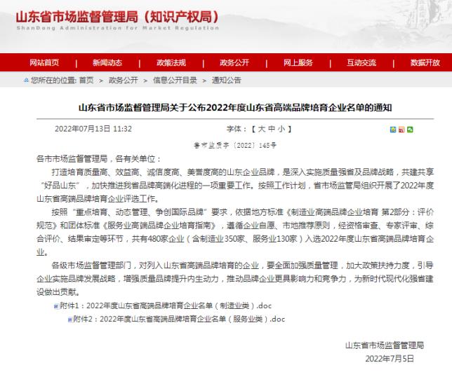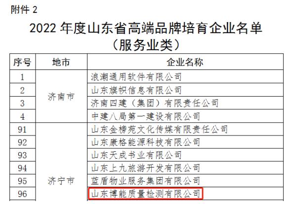 山東省市場(chǎng)監(jiān)管局發(fā)布《關(guān)于公布2022年度山東省高端品牌培育企業(yè)名單的通知》,公布入選企業(yè)名單,山東博能質(zhì)量檢測(cè)有限公司成功入選,并獲得山東省質(zhì)量評(píng)價(jià)協(xié)會(huì)頒發(fā)的榮譽(yù)證書。